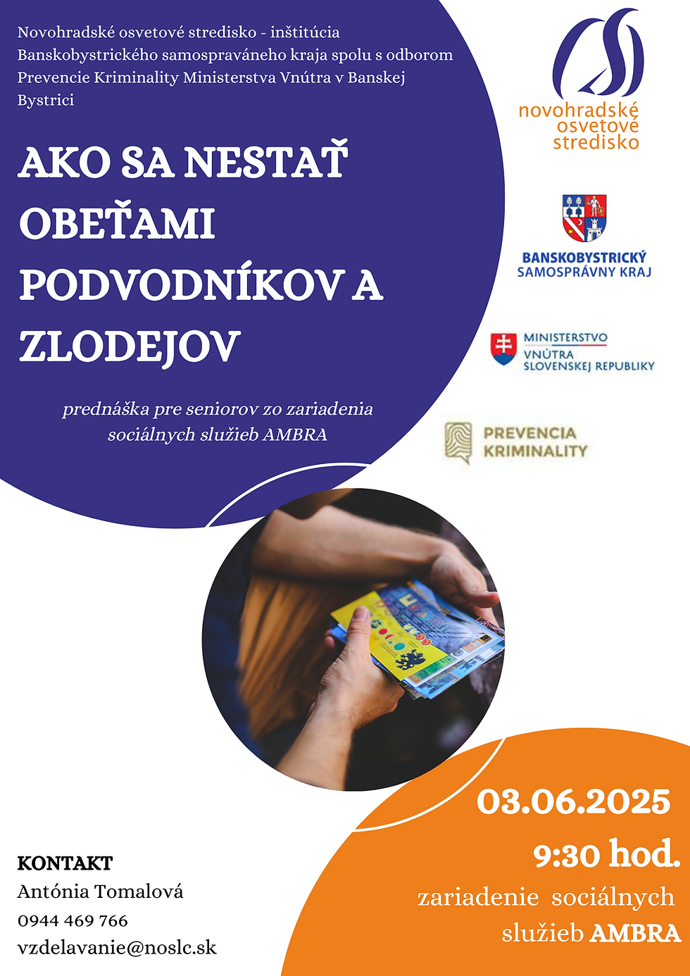Prednáška je venovaná praktickým radám, ako sa chrániť pred podvodníkmi a zlodejmi. Cieľom je zvýšiť povedomie seniorov o najčastejších typoch podvodov a posilniť ich schopnosť rozpoznať rizikové situácie v každodennom živote.